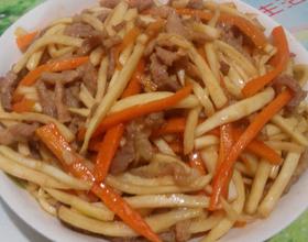 肉丝炒熟,放入茭白,红萝卜继续翻炒两分钟后加少许水,继续翻炒直至熟透,然后放少许盐和生抽.OK,关火.