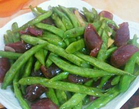 加少许清水,倒入蒸好的腊肠加盖焖2分钟左右,调入少许鸡粉煸一煸至四季豆熟即可出锅。