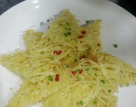 锅洗净上火烧至昌青烟,下油烧一下再倒入油缸子,再少加入色拉油,以免土豆丝沾锅,拉起锅下土豆丝!