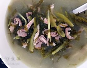 水开后放姜丝,猪肚丝、酸菜丝,小许盐、鸡精至水开关火上桌。