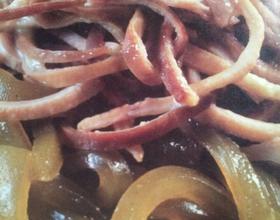 把粉皮放入盘水堆好,再放肚丝。浇调好的芥未糊
