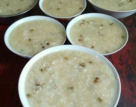 待绿豆煮一段时间后,将米倒入锅中。就这样一直让它煮,直到煮熟为止。
