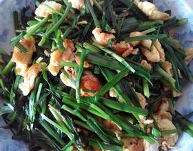 把鸡蛋搅成块,放韭菜梗翻炒半分钟左右