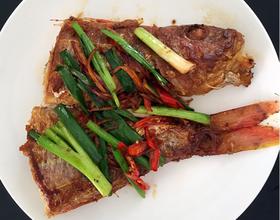 煎二十分钟左右,红杉鱼二边金黄色,淋上生抽放姜丝、葱丝、辣椒丝,关火装盘