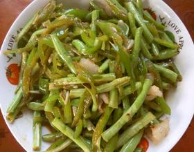青椒放在锅里炒热后倒入豆子,倒入少量水