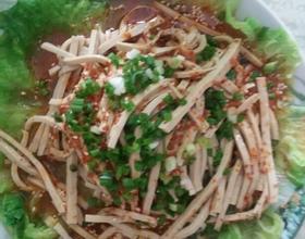 将豆干丝放入白菜盘里摆好,浇上调好的酱汁即可