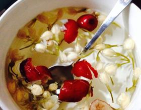 茉莉花放到杯子里,先用一点点开水洗茶,然后把红枣一起放进来,用开水冲泡,并且盖上盖子