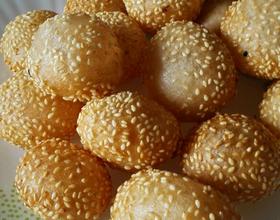 油入锅,待油温40度左右放入,并用勺子轻轻按压,麻团会慢慢变大,
