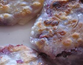 - 4. 面团醒面20分钟,然后搓成一小团,用擀面杖擀平之后,摊上紫薯馅。(这里的很多步骤都省略了图片,因为当时手忙不过来了。)
