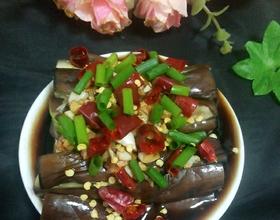 将凉拌汁淋在茄子上,最后表面撒上香葱和红椒碎即可