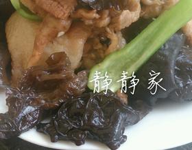 待到肉片熟的差不多时候,倒入黑木耳,香菇,放适量的盐,再闷炒一会。