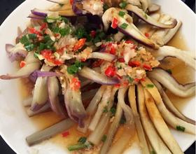 将茄子切成小丝,千万别切断,万一断了用牙签刺穿连接,放盐软化