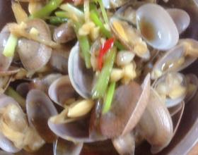 做法如下1。花蛤掉过开水,挑出会开的新鲜花蛤。洗干净,不然土腥味会很重。2。姜切丝,蒜头切碎,葱切段,小红辣椒切碎备用。3。热锅爆香调味料,加一碗淀粉水勾芡出汤汁。最后倒入(掉过开水洗净)的花蛤,翻炒一分钟即可。