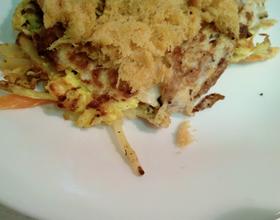 点破蛋黄,在蛋黄和蛋清还未完全凝固之前将炒好的土豆胡萝卜丝倒在上面,使鸡蛋将土豆丝和胡萝卜丝黏住。