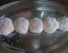 手抹水或抹油,这样皮才不会粘在手上,包上芒果,收口放入椰容里,滚一圈就可以装盘了
