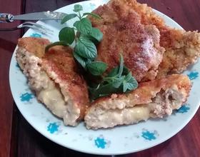 将腌制好的大排摊平,取一片奶酪片放在大排的一边,再将另一边大排搭过来盖住奶酪片并封口。