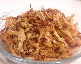 煮熟后沥干,用手顺着纹路撕条,不用撕得太细,烤制后会变干,太细会太有嚼劲