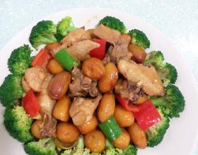 炒至鸡肉有点变白色就下富贵子,一起炒一分钟左右加上适量的水,加上锅盖转中小火焖二十分钟~