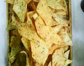 成品,把面团铴二十分钟后,分成三份。擀成大张,切菱形片。四成油温下蕉叶,炸熟起锅。