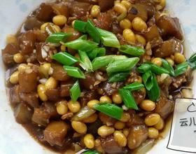 - 1. 圆茄子去皮洗净切小方丁,泡好黄豆提前煮熟,其它调料备齐