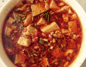 加入适量的盐继续煸炒,加入麻婆豆腐调料加水