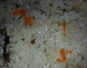 放油爆香,下肉丝、香菇、胡罗卜炒出香味,在糯米饭后调味可直接食用。