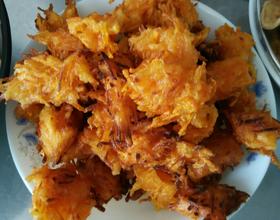 除油刚入锅和起锅时,火大外,炸的过程,都要小火,容易糊;胡萝卜是甜的,盐不要多放;水要试着放,边放边拌,水拌匀了,还干,再小点小点的加