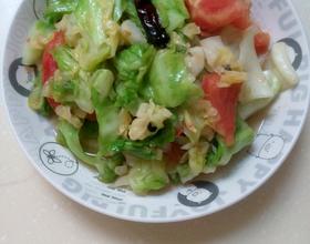 捡出花椒粒,入姜丝煸炒',下甘蓝爆炒至断生,加盐,十三香,西红柿大火炒,加点蔬之鲜,葱花蒜片颠勺出锅