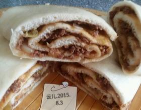 - 4. 拿一个面挤用擀面杖擀薄,抹上牛肉馅