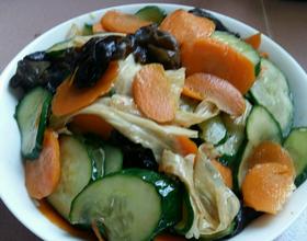 青瓜易熟,不易炒太久。油可以根据个人口味,换成葵花油,玉米油之类的。我放盐的勺子是300毫升的小勺子。(可以根据口味适当的放盐,酱油)