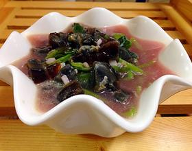 刀上抹醋,将皮蛋剥皮、切小丁