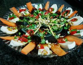将豆腐切成薄片摆在松花蛋的缝隙间。
