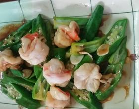 放入蒜片姜片爆香,加秋葵虾球炒匀