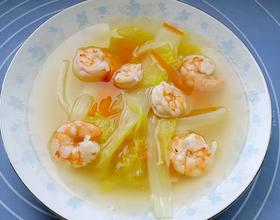 捞出大虾,留下底汤,下入娃娃菜和胡萝卜丝,加入半小匙蚝油和0.5克盐煮10分钟勾少许水淀粉