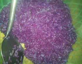 把洗好的 糯米放入紫色水中泡三小时,成起去干水备用。