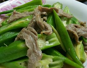 接着倒入秋葵翻炒,调味;少许盐,鸡粉,酱油;少许热水快速翻炒入味。