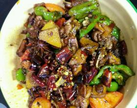 锅里放油下兔肉 姜片 蒜片一起炒,水份炒干后放入干红辣椒 花椒炒至兔肉微黄色下豆瓣酱少许 加水煮干