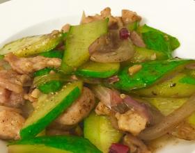 加入腌制好的猪肉和洋葱煸炒至肉片变色及洋葱变软,略成透明状。放入黄瓜,倒入生抽,翻炒均匀后加入盐,再继续炒30秒即可