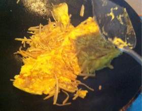 小孩子很喜欢吃了菜哦,土豆丝炒熟的时候用锅铲横断,在放鸡蛋