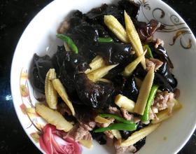 菜油熬熟下肉片,翻炒后下玉米笋木耳,盖锅盖片刻放辣椒及调味料