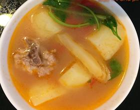 炒好的土豆、番茄倒入排骨汤中,中火25分钟加入酸菜,下少许盐、鸡精关火
