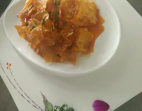 - 4. 4、找一个盆,放入红薯片、盐、味精、花椒粉(油)、芝麻油、蒜沫、白芝麻、红油(少量,红薯片表面有少量就够了)、拌均匀撒上葱花,装盘。