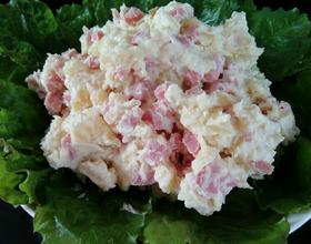 把蒸好的土豆晾晾,碾碎和火腿肠,沙拉一起拌匀。
