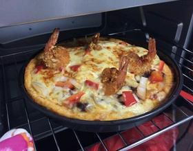 - 5. 披萨饼表面刷满披萨酱,把腌制好的牛肉,切好的洋葱,青椒、红椒、放在上面摆放均匀,撒上芝士,把炸好的金虾中间切开口,立着摆放上去。