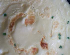将油倒入锅中微烫后将面粉糊分三次倒入,形成饼状就大功告成