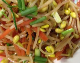 干锅煸炒不用油,煸过再炒豆芽更香。胡罗卜先下锅用油爆炒更利于营养元素溶于油中。不用其它调料,只用盐调味,突出豆芽本色香味。香葱搁入是点睛之作,马上香味四溢。