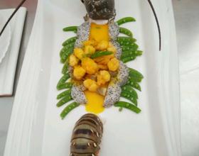 亮锅 倒入油 6成油温 龙虾下入炸制金黄色捞出 刷锅 四季豆焯水 加上火龙果 摆盘