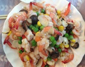 锅放油滑虾仁后起锅,放底油将百合,青豆及玉米下锅放虾仁翻炒起锅装盘