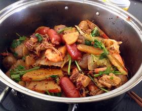 把准备好的食材倒进锅里翻炒,加入大白菜和萝卜,再加入一汤匙酱油和鸡粉~十五分钟后关火。