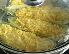把盐,油,味素放到2图里,拌匀。再把拌好玉米放到玉米叶上。